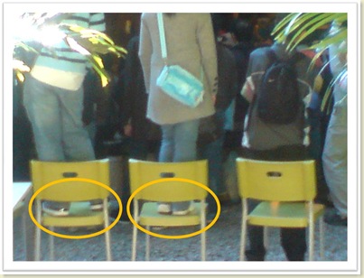 | 上一篇【時事】台灣的道德教育當中,提到了國人對垃圾分類教育的忽略與現象,今天,來看看另一個情景。 看到圖片中黃色圈圈的部份嗎?這是一個動物表演秀,只要觀眾一多,就會有許多人搬走我們家餐廳的椅子,放到座位區後方,像圖片這樣,站到椅子上去。 請大家替別人想想,也替自己想想,因為,你也有可能坐到,那張別人曾經踩過小狗便便、又站在上頭的椅子!