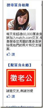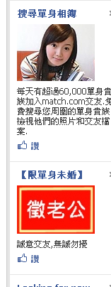 上星期還接到那種「婚友社」的電話,還說透過篩選才能獲得受邀請的資格,我一面拒絕,心裡的OS一樣再次響起,「有篩選還選到我,你們家的篩選機制可以廢掉了。」就連臉書上頭,每次右邊出現的廣告都是像下面這種: