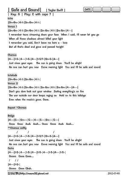吉他譜|調式和弦譜|Safe and sound - Taylors Swfit - 電影(小說)飢餓遊戲主題曲