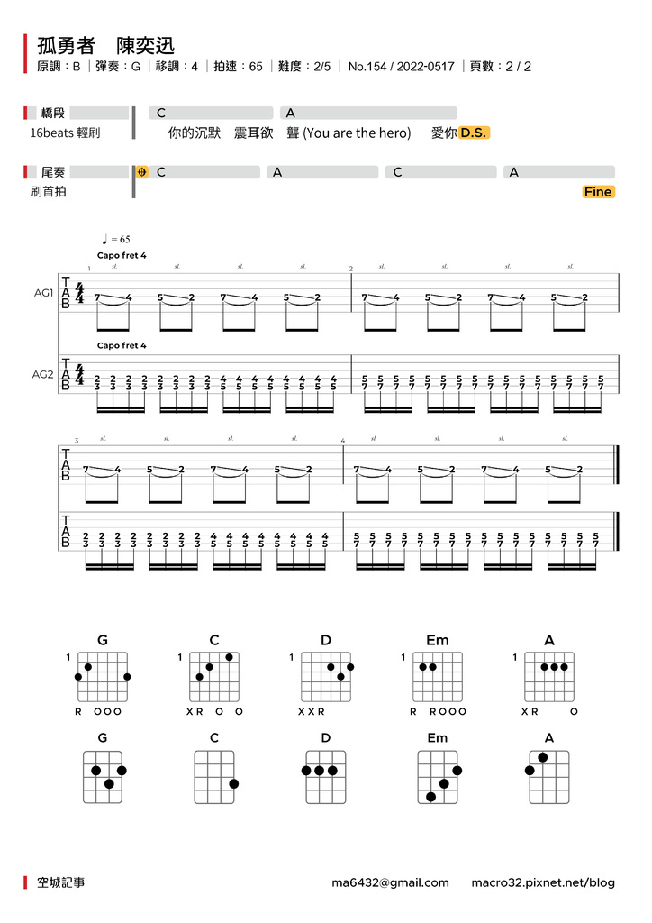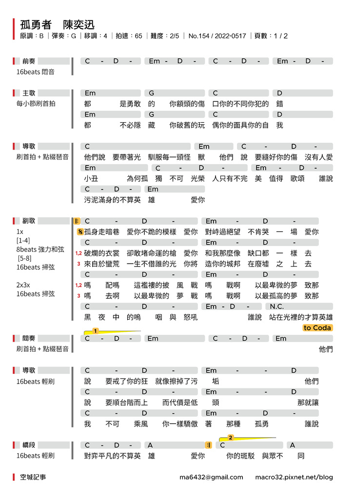 【No.154】【孤勇者 - 陳奕迅】吉他和弦譜