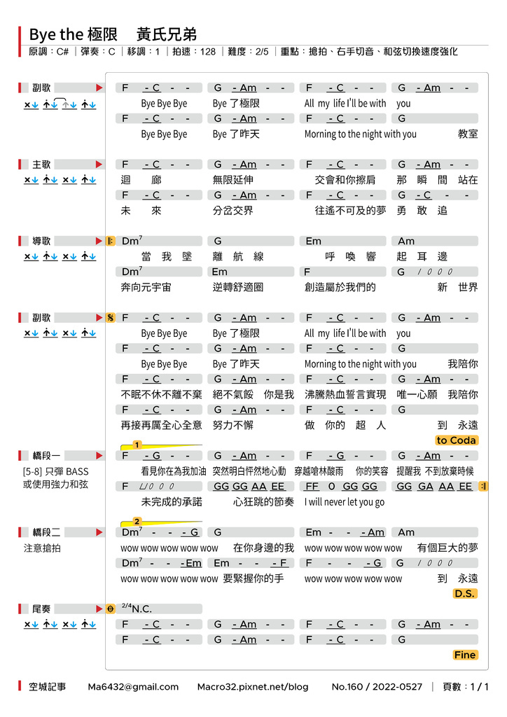【No.160】【Bye the 極限 - 黃氏兄弟】吉他和弦譜